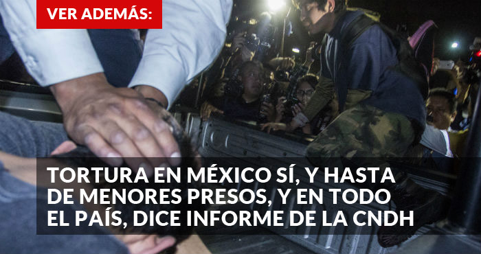 Ciudad de México, 23 de diciembre (SinEmbargo).– “La tortura y los malos tratos durante los momentos que siguen a la detención y antes de la puesta a disposición de la justicia son generalizados en México y ocurren en un contexto de impunidad. Generalmente la finalidad es castigar o extraer confesiones o información. Hay evidencia de la participación activa de las fuerzas policiales y ministeriales de casi todas las jurisdicciones y de las fuerzas armadas, pero también de tolerancia, indiferencia o complicidad por parte de algunos médicos, defensores públicos, fiscales y jueces".
