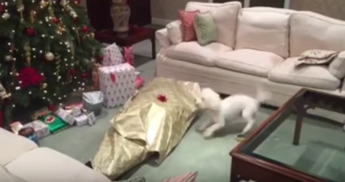 El cachorro de Noel Parsons se puede ver en el video corriendo y ladrando al rededor de un paquete gigante que se encuentra en el centro de la sala. Después de dar varias vueltas en torno al regalo, el cánido hace su mayor esfuerzo para romper el papel que resguarda su presente.