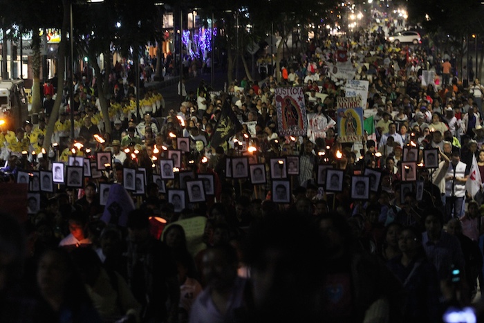 Durante el recorrido, 43 antorchas, con fotografías de los jóvenes desaparecidos, alumbraron Paseo de la Reforma y Calzada de Guadalupe, mientras que cientos de personas clamaban justicia.