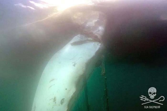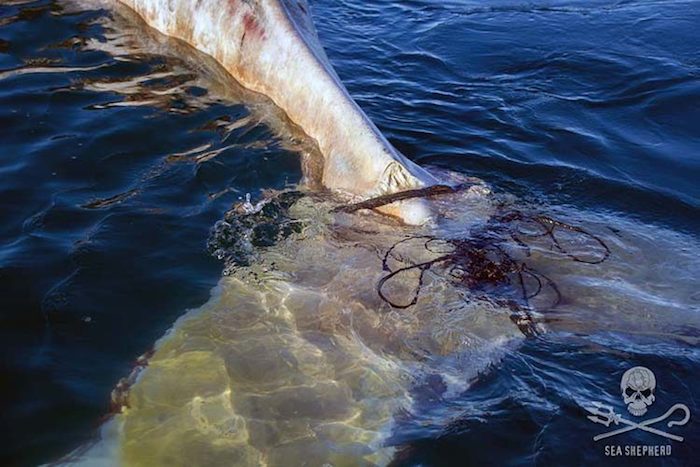 Después del registro de la ballena a la distancia, la tripulación hizo una inspección más cercana y descubrió que la aleta derecha de la ballena se enredó en la trampa. La red se encontraba anclada hasta el fondo del mar. La cola también estaba enredada con otras líneas de pesca. La tripulación del R / V Martin Sheen alertó a las autoridades gubernamentales con las coordenadas de la ballena para que pudieran eliminar los restos de la red antes de que matara a otra especie marina.