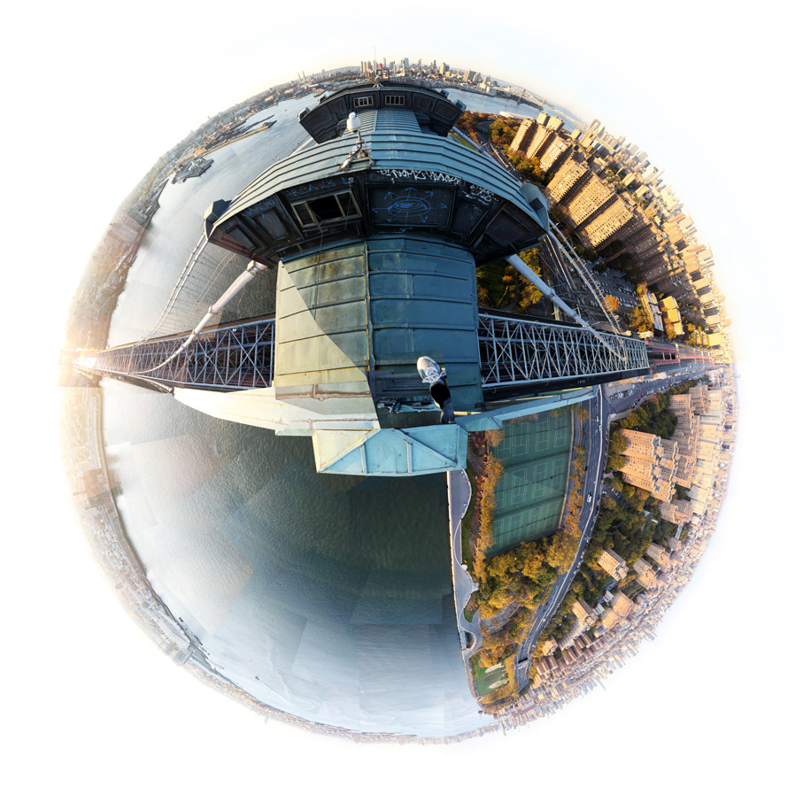 Las panorámicas que presenta parecieran que fueron tomadas desde un satélite en el espacio, pero en realidad son cientos de fotografías que capturan un lugar con una visión completa de 360 grados. Todas unidas como un rompecabezas y sin ayuda de Photoshop. Con estas imágenes en forma de globo nos da la ilusión de observar al mundo desde arriba.