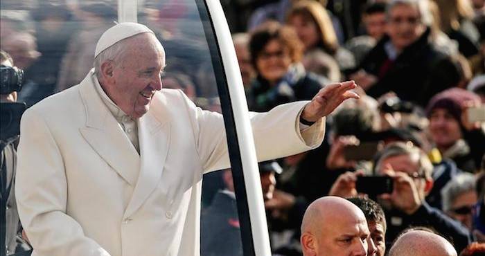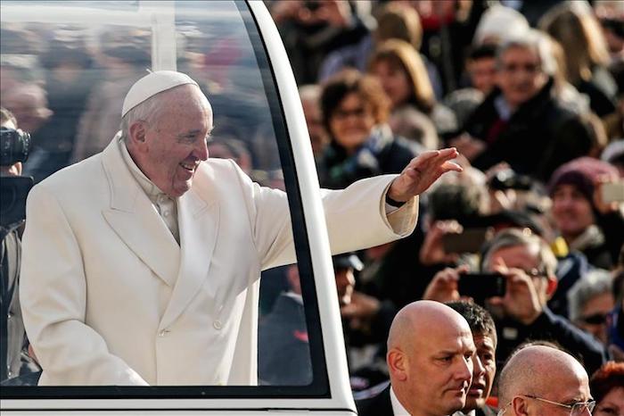 El Papa saluda a los fieles a su llegada a la audiencia general de los miércoles en la plaza de San Pedro en el Vaticano. Foto: EFE