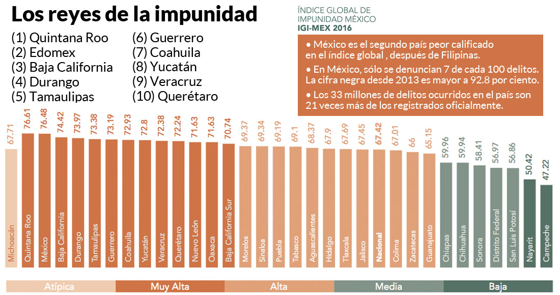 Guanajuato, Zacatecas, Colima, Jalisco, Tlaxcala, Hidalgo, Aguascalientes, Tabasco, Puebla, Sinaloa y Morelos fueron clasificados como los estados con un Índice de Impunidad Alto. En el caso de San Luis Potosí, la Ciudad de México, Chihuahua y Chiapas, fueron catalogados con un nivel medio de impunidad, mientras que Campeche y Nayarit con uno bajo.