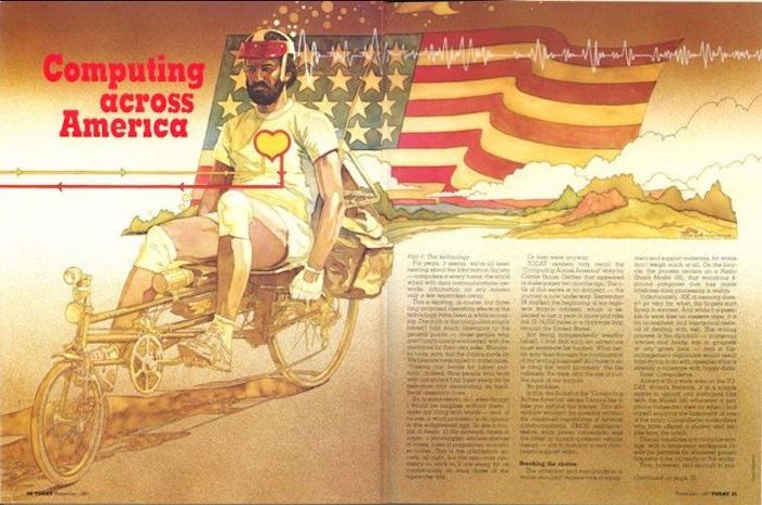 En seis meses, había construido su propia bicicleta-oficina, en la que portaba elRadio Shack TRS-80 Modelo 100, un asequible portátil con una pequeña pantalla que se hizo especialmente popular entre los periodistas de la época y que entusiasmaba a Bill Gates. También la equipó con un sistema de seguridad gracias a unos sensores, un panel solar para cargar las luces y la batería del portátil, un equipo de comunicación por radio y una tienda de acampada para detenerse a escribir donde deseara.