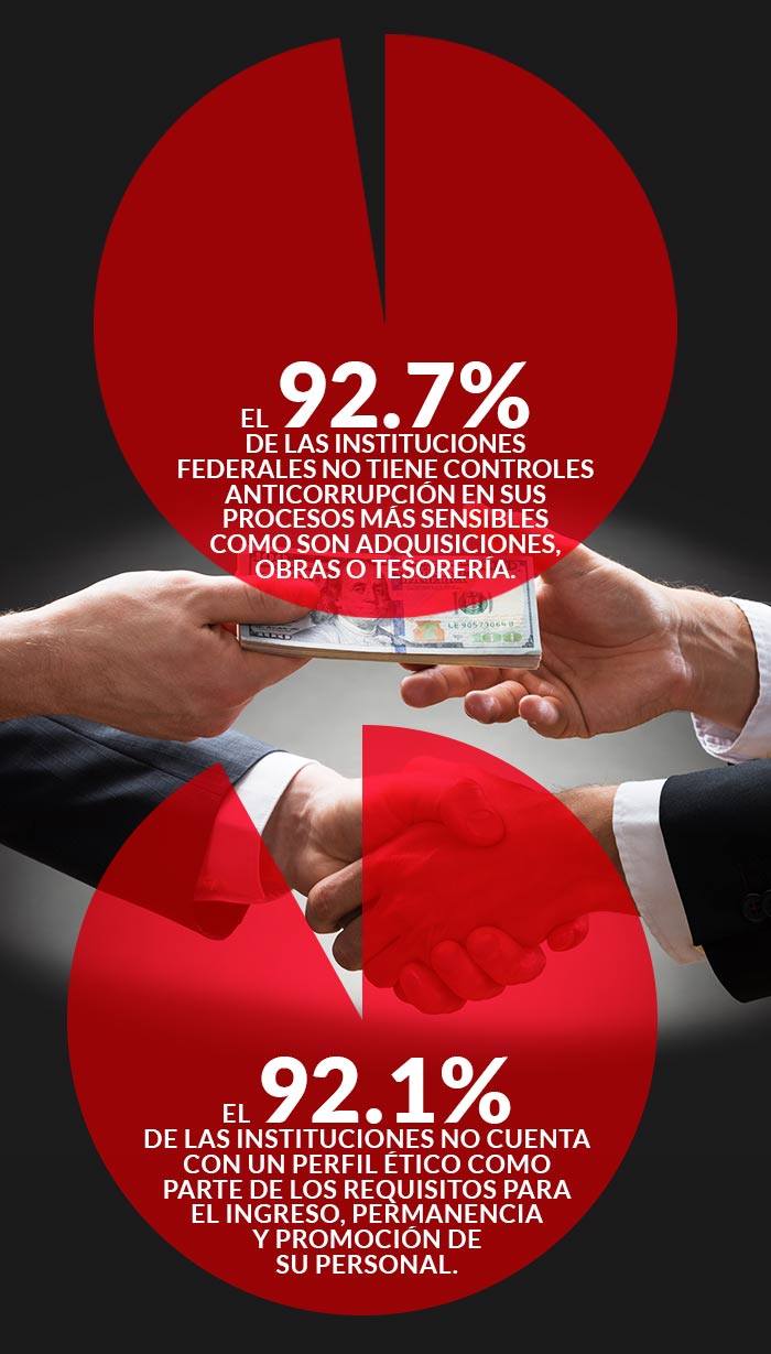 La Auditoria Superior de la Federación (ASF) identificó que la mayoría de las instituciones federales no cuenta con controles en los procesos más sensibles a posibles actos de corrupción, como son adquisiciones, obras o tesorería. Encontró además falta de sensibilización y capacitación sobre corrupción y de mecanismos formales y confiables para que cualquier interesado denuncie este tipo hechos, e identificó que la mayoría de los instituciones omite el perfil ético de los candidatos a un cargo público.