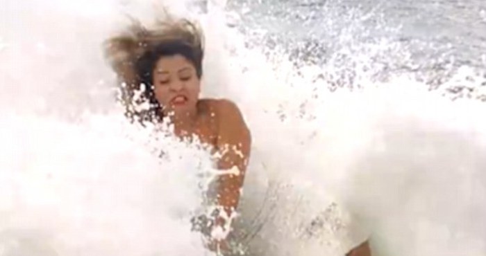 La grabación deja ver a la mujer usando un vestido con encaje blanco, acariciando su cabello y poniendo su mejor sonrisa. De pronto, voltea hacia atrás y se percata de que una ola se aproxima, sin embargo, no puede hacer nada y la ola la derrumba. La última cosa que se ve en el video es el brazo aferrarse a la roca.
