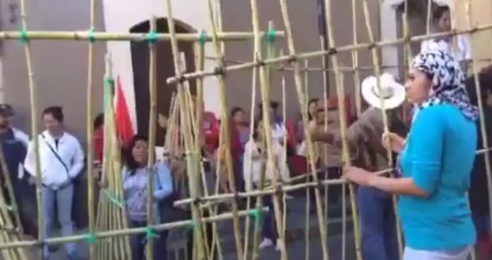 La Sección 22 de la CNTE y organizaciones sociales bloquearon con carrizos los alrededores de la Casa Oficial del Gobernador Gabino Cué, a quien exigen una reunión, justicia para maestros que están presos y la presentación con vida de uno de sus compañeros que está desaparecido desde hace cinco años.