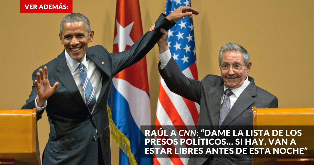 Un periodista estadounidense preguntó hoy en La Habana a Castro "por qué hay prisioneros políticos en Cuba" durante la conferencia de prensa que los presidentes cubano y estadounidense ofrecieron después de su reunión bilateral. Castro la desafió y le dijo que le diera la lista. Hoy, el Departamento de Estado de Estados Unidos afirmó que "claramente aún hay personas detenidas por razones políticas" en Cuba.