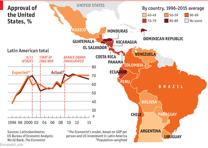 Trump ha generado un amplio sentimiento anti-mexicano en Estados Unidos desde el inicio de su campaña. Ha llamado a los migrantes de México “violadores, drogadictos, traficantes”. De acuerdo con una encuesta de The Economist publicada esta semana, ese sentimiento de rechazo es ampliamente correspondido por México –donde más de 50 por ciento de la población rechaza al Gobierno de Estados Unidos– y en América Latina en general, excepto Honduras, Salvador y República Dominicana.
