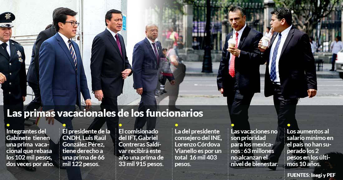 Los miembros del Gabinete pueden disponer de ella, además, en dos ocasiones al año y el monto por prima vacacional asciende a los 102 mil 561 pesos, por percepciones brutas mensuales de 205 mil 122 pesos.