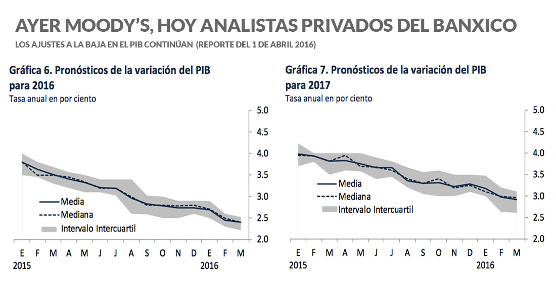 Actualmente el gobierno prevé un crecimiento para 2016 de entre 2.6 y 3.6 por ciento, el cual es mayor que el estimado por el banco central. El 3 de marzo pasado, el Banco de México revisó a la baja el intervalo para el crecimiento del Producto Interno Bruto (PIB) de México para 2016 en medio punto porcentual al ubicarlo a uno de entre 2 y 3 por ciento en comparación con el de entre 2.5 y 3.5 por ciento previsto en el informe anterior.