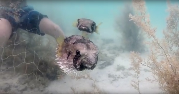 Un pez erizo queda atrapado en una red pero su mejor amigo no se va de su lado (VIDEO)