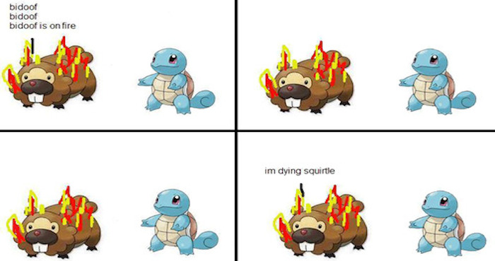 Inició con un video en el cual se ve al pokémon Bidoof en llamas mientras "habla" con Squirtle a ritmo de "Sigue al líder", del dueto cubano S.B.S. En la conversación se sustituye "the room is on fire" por "Bidoof is on fire" y concluye con "I'm dying, Squirtle" (estoy muriendo, Squirtle) y la imagen con la que se ha popularizado el meme.