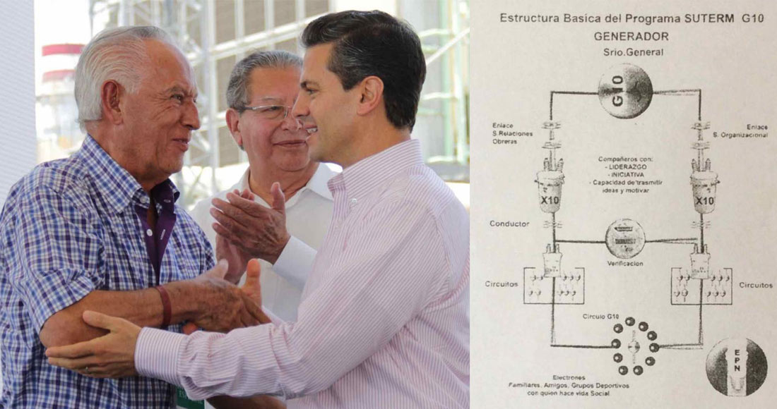 El plan electoral del SUTERM — conformado en su mayoría por trabajadores de la Comisión Federal de Electricidad (CFE), empresa estatal de energía eléctrica en México — utilizó a los empleados sindicalizados, pues cada uno de los más de 70 mil afiliados tendría que haber convencido a 10 personas para votar por el entonces "candidato" del PRI, según se infiere a partir de la gráfica que mostramos a continuación, en la cual aparecen las iniciales "EPN" y al lado el logotipo de su campaña donde se escribe "Enrique Peña Nieto". Los sindicalizados, según testimonios, tenían que hacer campaña así fuera en sus horarios laborales, e incluso hablan de coacción.