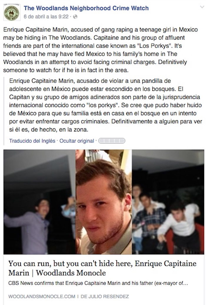 "Capitaine y su grupo de amigos influyentes son parte del caso internacional conocido como 'Los Porkys'. Se cree que puede haber huido de México a la casa de su familia en The Woodlands en un intento de evitar enfrentarse a cargos criminales. Definitivamente se debe vigilar si él está en la zona", dice un mensaje publicado en el grupo de Facebook, The Woodlands Neighborhood Crime Watch.