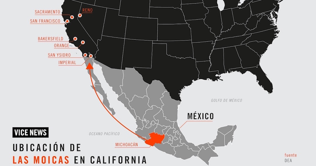 En el año 2009, cuando el grupo fue detectado en California, vendían su producto en San Francisco, Oakland, San Jose, Palo Alto, Hayward y San Leandro. Han pasado casi siete años y el cártel está ganando terreno en las ciudades más importantes. Las Moicas operan actualmente en San Francisco, Sacramento, Bakersfield, Orange, San Ysidro e Imperial. Y su presencia también se ha detectado en Reno, Nevada.