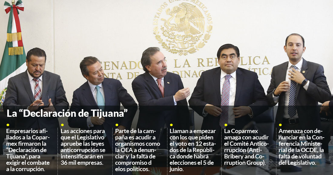 Los empresarios de México urgieron al Senado a aprobar las leyes reglamentarias del Sistema Nacional Anticorrupción (SNA), luego de que ayer los legisladores acordaron convocar a un periodo extraordinario de sesiones posterior a las elecciones, violando el plazo constitucional para avalar estas reformas, que vence el 28 de mayo. Los afiliados a la Coparmex firmaron la llamada declaración de Tijuana en la que advirtieron que denunciarán ante instancias internacionales y organismos aliados, la falta de compromiso del Legislativo para atacar la corrupción. La cámara empresarial afirma que buscan mantener un sistema de privilegios e impunidad en contra de la mayoría de los ciudadanos.