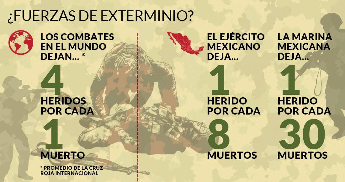 Pero en México el número de muertos se invierte. Por una parte, el Ejército mexicano mata a ocho enemigos por cada uno que hiere; mientras que en las fuerza de élite de la Marina, la diferencia se hace aún más pronunciada: los datos que ellos mismo proporcionan, dicen que matan a 30 por cada uno que lesionan.