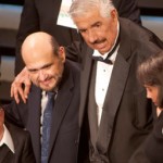 El compositor, acompañado por Carlos Lara y Roberto Cantoral Zucchi, a nombre de la Sociedad de Autores y Compositores de México, entregaron un corazón y sellaron la amistad con un abrazo y un beso.