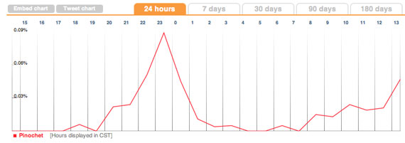 Los gráficos de Trendistic demuestran que solamente durante unas horas bajó la intensidad del hash tag o etiqueta “Pinochet”, pero esta tarde ha vuelto a revivir con fuerza.