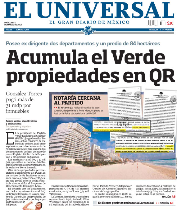 De acuerdo con El Universal –en su edición impresa–, que cita el Registro Público de la Propiedad y el Comercio en Cancún, las escrituras 42 mil 699 y 42 mil 701, que están a su nombre, detallan que los inmuebles están ubicados en la exclusiva Torre Emerald. Otra de las propiedades pertenecientes al ex dirigente del PVEM es un terreno de 84 hectáreas en una zona sujeta a protección ecológica; en este predio sólo se podrá construir si se modifica el Programa de Ordenamiento Ecológico Local.