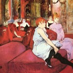 Sobresale una de sus más conocidas obras: “En el salón del burdel de la calle de Molinos” (Au Salon de la rue des Moulins), elaborada al óleo sobre lienzo en 1894 y que marcaría la culminación colorida de una notable serie de trabajos donde Lautrec retrató a mujeres galantes, madammes de antros y prostitutas (su amada favorita era Mireille), damas que pintaría siempre con mayor simpatía sobre los hombres prexenetas y clientes.
