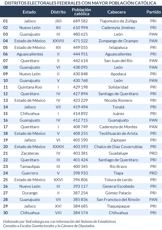 Destaca el hecho de que los dos distritos con más población católica son priistas. Es el caso del distrito XII de Jalisco, con cabecera en Tlajomulco de Zúñiga, y el XII de Nuevo León, con sede en Cadereyta Jiménez.
