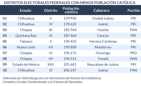 Los diez distritos con menos católicos se encuentran en los estados de Chiapas y Chihuahua, con tres cada uno, así como en el Estado de México, Nuevo León, Quintana Roo y Tabasco. De esta lista, seis han sido ganados por el PRI, tres por el PAN y uno por el PRD.