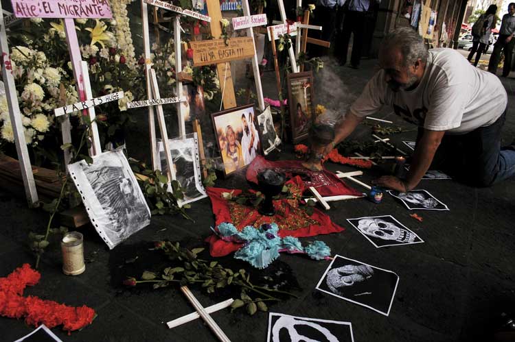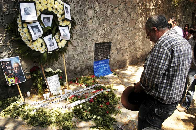 CUERNAVACA, Mor. (proceso).- La Plaza de Armas luce semivacía, sólo frente al Palacio de Gobierno hay unos cientos de personas oyendo historias sobre más muertos y desaparecidos en el país. Decenas de cruces de madera regadas por el suelo junto a flores, poemas, denuncias y muchas fotos, forman el altar que desde hace un año se instaló para recordar a las miles de víctimas de la guerra contra el narcotráfico que día con día se van amontonando.