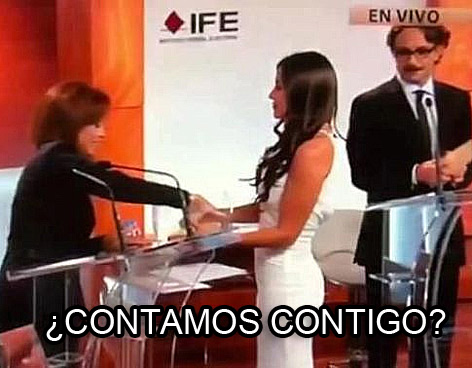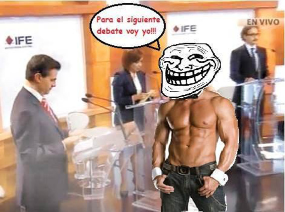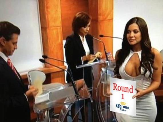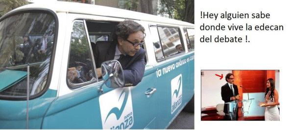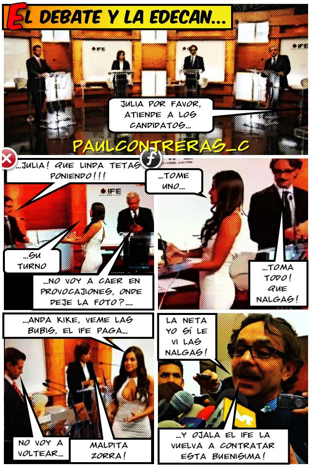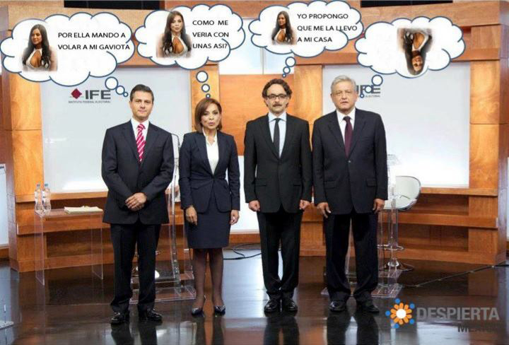 Julia Orayen, la edecán que causó furor por los segundos que apareció en el debate presidencial, es ahora “meme”. Ella y el candidato del Panal, Gabriel Quadri. Tanto por Facebook como por Twitter circulan imágenes tomadas de la televisión que son alteradas en Photoshop.