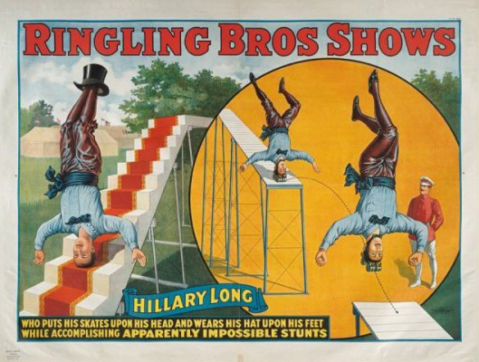 Hillary Long quien se coloca sus patines en la cabeza, afiche del circo Ringling Bros. 1917.