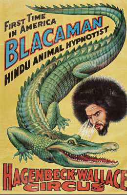 Blacaman, Hipnotista de Animales Hindú , afiche del circo Hagenbeck-Wallace, 1938.