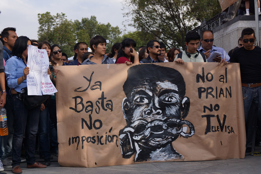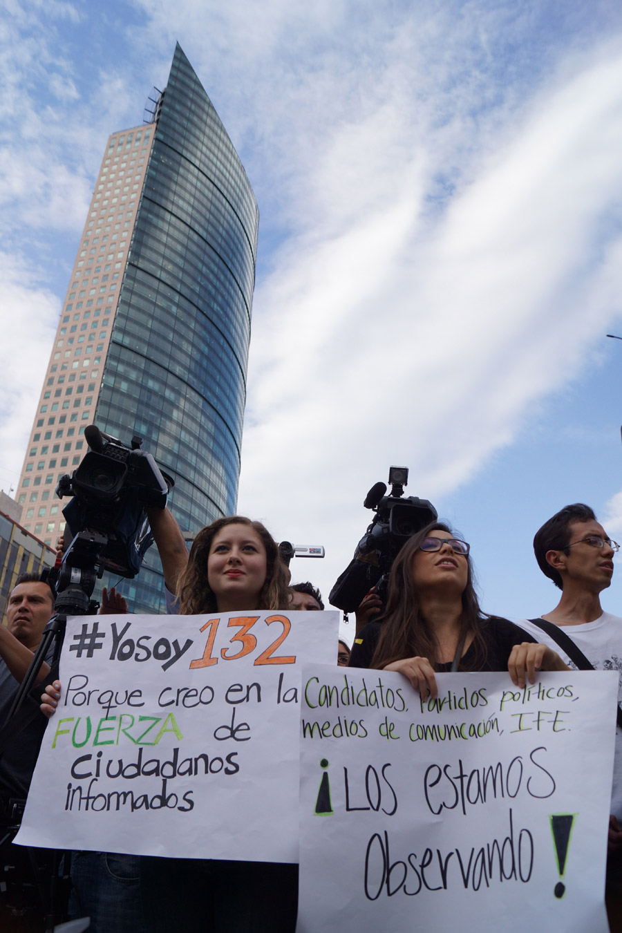 “Más información, no a la imposición”, “Hasta cuándo dejarán de mentir Televisa y TV Azteca”, “Televisa, dictador de la información”, “La pantalla presenta una sociedad teledirigida”, “No te creas de las encuestas, mejor ve el debate”, se leía en algunas de las cartulinas.