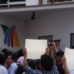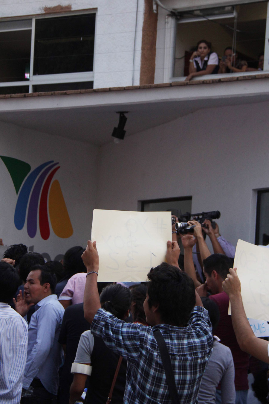 “Dónde está, donde está, Televisa dónde está”, “Apaga la tele, enciende tu cerebro”, coreaban los jóvenes que pedían la presencia de algún representante de la televisora que fue cerrada con llave.