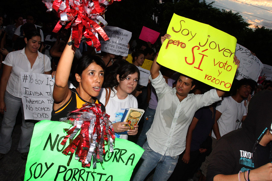 Aunque no portaron ningún logotipo o nombre de partido o candidato, los jóvenes sí gritaron consignas contra el aspirante presidencial Enrique Peña Nieto y contra la posibilidad de que las televisoras y otros medios manipulen la información para intentar imponerlo como triunfador de los comicios del 1 de julio.