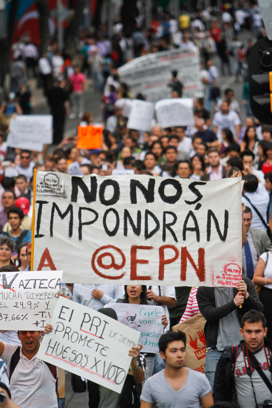 Los mensajes decían: “#Yo soy 132”, “No vine por mi lonche, vine por mis huevos”, “Peña, la TV es tuya, la calle nuestra”, “Paz y libertad, el viento trae revolución”, “Ni televisa, ni TV Azteca, ni MM”, “Por qué no dices la verdad, Televisa”.