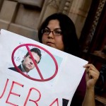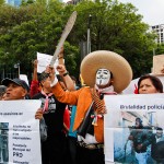 Sin pronunciar palabra alguna, los manifestantes dieron tres vueltas a la explanada de la Patria y lanzaron consignas contra el aspirante presidencial priista y pidieron que sea equitativo el manejo de información de las campañas presidenciales.