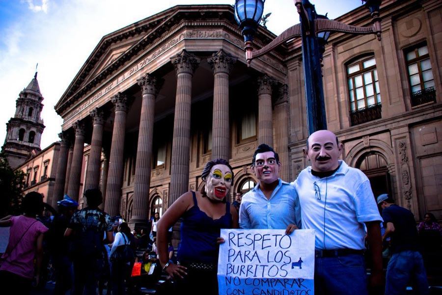 “¡Televisa te idiotiza, TV Azteca te apendeja!”, corearon durante la marcha que horas partió, a las 18:00 horas, de la Plaza de Colegio Civil, de la UANL rumbo al primer cuadro de la ciudad.