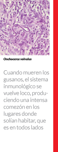 Pronto, habrá cientos de millones de gusanos microscópicos bajo toda la piel, sistema linfático y ojos. Una vez que los gusanos alcanzan la superficie de la córnea, ésta se inflama, causando que se opaque con el tiempo y provocando ceguera.