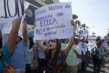 LA PAZ, BAJA CALIFORNIA SUR, 02JUNIO2012.- Jóvenes que forman parte del movimiento "Yo Soy 132" se manifestaron en las inmediaciones del estadioArturo C. Nahlm, en donde el candidato presidencial Enrique Peña Nieto encabezó un mitin. Los manifestantes se pronunciaron por unas medios de comunicación con ética y un al alto a la manipulación mediática.