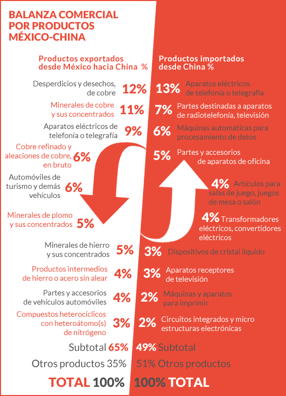 México es el segundo socio comercial de China en América Latina y también el mayor destino de exportación de China en esta región. En su relación con México, el intercambio está marcado por importantes datos, en los que sobresale el alto volumen comercial pero con pocas inversiones entre ambos países. Según ProMéxico, 75% de las exportaciones mexicanas a China son manufacturas, principalmente de cobre, celulares, computadoras, circuitos integrados, módulos microelectrónicos y autopartes. En cambio, 97% de las importaciones mexicanas provenientes de China son manufacturas. China exporta a México principalmente computadoras y equipos de comunicación, ropa, televisores, radios, accesorios de equipos de procesamiento de datos y otros.