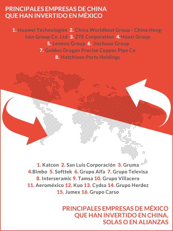 Datos de la embajada de China en México señalan que en la actualidad, México constituye uno de los principales destinos de inversión de China en Latinoamérica. “En total, 57 empresas chinas han arrojado 400 millones de dólares de inversión en México. Mientras tanto, México maneja 109 proyectos con 65 millones 270 mil dólares de inversión en China. Entre los proyectos invertidos y contratados de China en México sobresalen el desarrollo agrícola de Xintian-México SA de CV, Fábrica de Textil de Sinatex SA de CV, así como los proyectos de servicio petrolero del PetroChina y Sinopec, etcétera”.