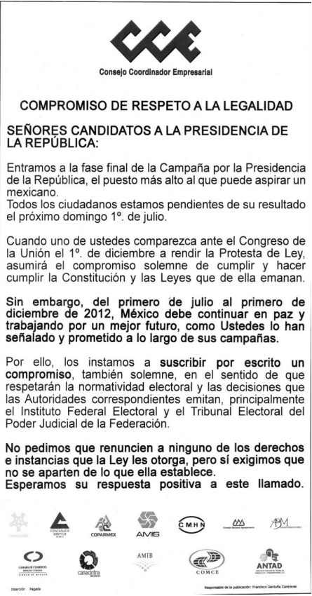 El Consejo Coordinador Empresarial publicó esta mañana un desplegado en diversos medios de comunicación en el que pide a los candidatos presidenciales respetar los resultados de los próximos comicios del 1 de julio.