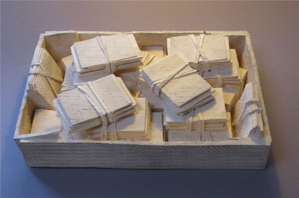 A primera vista, no se creería que la obra de Ranadall Rosentahll es de madera; para empezar ni siquiera se pensaría que se tratan de esculturas. Sin embargo, lo que parecieran cajas y tarjetas de beisbol amontonadas son en realidad piezas esculpidas.