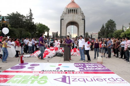 En la Explanada del Monumento a la Revolución, el grupo de jóvenes proclamó además 60 compromisos de Peña Nieto, como construir un sistema de seguridad social universal e incrementar la partida para educación superior.