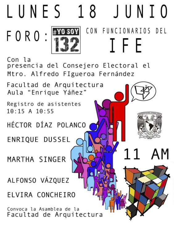 El Consejero del Instituto Federal Electoral, Alfredo Figueroa Fernández llevará a cabo una reunión con integrantes del Movimiento #YoSoy132 en el Auditorio Enrique Yañez de la Facultad de Arquitectura de la Universidad Nacional Autonoma de México el próximo lunes 18 de junio.