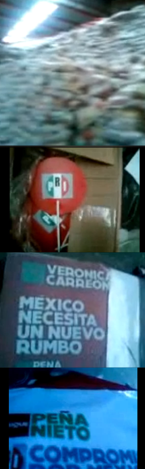 La bodega, de acuerdo con la denuncia –y como se puede observar en las imágenes–, contiene montañas con miles de despensas, sillas, botellas, morrales, cachuchas, colchonetas, paraguas y otros regalos que llevan el logotipo del Partido Revolucionario Institucional (PRI) y de su candidato, Enrique Peña Nieto.