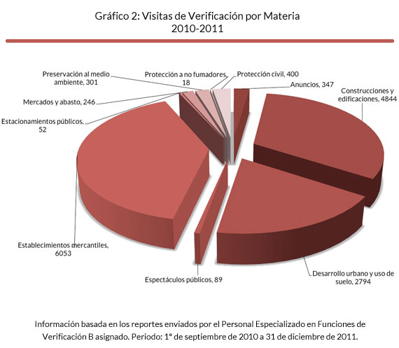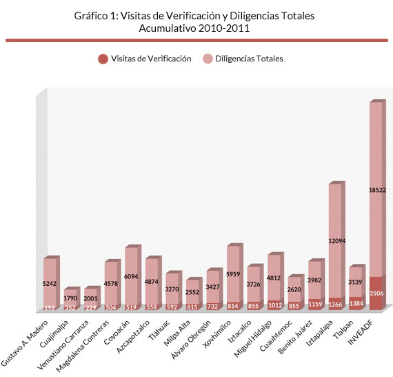Desde septiembre de 2010 a la fecha el personal del INVEA –centralizado y adscrito a las Delegaciones– ha efectuado casi 121 mil diligencias de la más amplia gama (ver gráficos 1 y 2), incluyendo establecimientos mercantiles. “No se omite mencionar, que al practicar una visita de verificación en esta materia, se faculta la suspensión y/o clausura de establecimientos que no cumplan con los requerimientos de protección civil o cuando se ponga en riesgo la vida o bienes de una persona a través de los artículos 70 y 73 de la Ley de Establecimientos Mercantiles del Distrito Federal”.