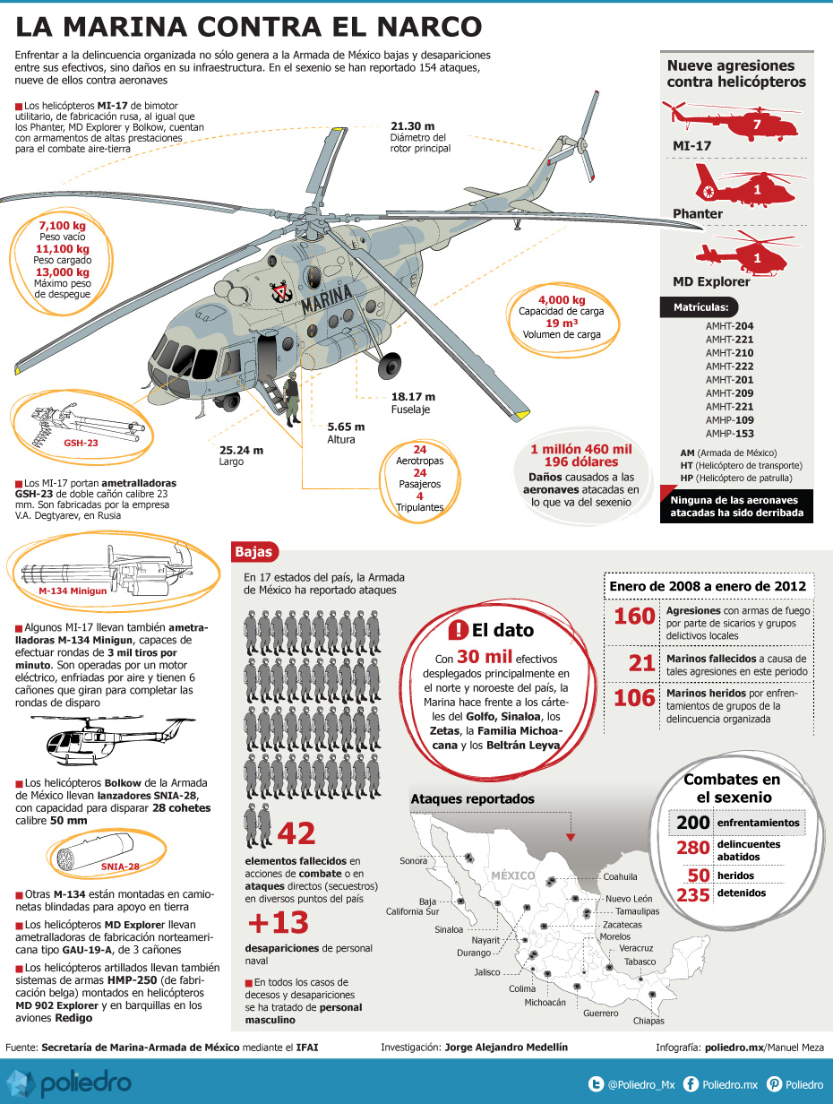 INFOGRAFÍA: La Armada de México en el narco: bajas, desaparecidos y daños en infraestructura Redacción/SinEmbargo 19/06/2012 - 12:01 am Para poder ver la infografía dar click en la imagen. Redacción/SinEmbargo Lo dice el reportero + Sección Opinión Inconstitucionalidad de la sobrerrepresentación "La configuración actual del Congreso representa una sobrerrepresentación anticonstitucional que pone en riesgo el sistema de controles... Por Gustavo de Hoyos Walther Altruismo sin reglas: el riesgo del cuidado animal "La paradoja de los espacios dedicados al cuidado de los animales sin hogar: nacen del impulso de... Por Salvador Guerrero Chiprés El exhorto de la UNAM por la necesaria cohesión nacional "Quizás ahora lo que no se logre desde el poder, desde el Estado, si es que continúa... Por Jaime García Chávez Imperialismo sin complejos "La nueva política internacional de Estados Unidos ahora ya no pretenderá encubrir sus ambiciones de poder y... Por Rubén Martín + Sección Opinión en Video Por Ana Lilia Pérez Extorsiones trumpianas Por Álvaro Delgado Gómez Contra la censura Por Alejandro Páez Varela Qué debilita a la Presidenta. Notas. Por Jorge Zepeda Patterson Manual para sobrevivir a un ataque de Trump Por Muna D. Buchahin Anonimato Por Daniela Barragán ¿Qué es María Corina? Por Héctor Alejandro Quintanar La derecha mexicana es trumpista Por Pedro Mellado Rodríguez Los buitres del imperio merodean sobre México Por Lorenzo Meyer La era de mala vecindad Por Fabrizio Mejía Madrid El mito de Venezuela + Sección Galileo La lactancia materna protege la salud mental de madres hasta 10 años después: estudio El "burnout" no es igual que el estrés; "es más problemático", explica una psicóloga ¿Consumes creatina como suplemento para ejercitarte? Mitos y verdades que debes saber Científicos de EU exigen a Trump soltar Groenlandia, clave frente al cambio climático FOTOS ¬ Albañiles hallan presunta tumba mixteca en Oaxaca; el INAH la autentificará ¿Por qué adolescentes necesitan dormir más el fin de semana? Un estudio lo explica Estudio revela que dormir mal puede provocar demencia en personas de la tercera edad Caldos, tecitos, reposo, agua... cómo los remedios caseros funcionan contra la gripe El orgasmo femenino puede provocar risa, llanto o dolor de pies, según un estudio ¿Plaga de cucarachas en casa? ¡Cuidado! Sus toxinas pueden provocar asma infantil