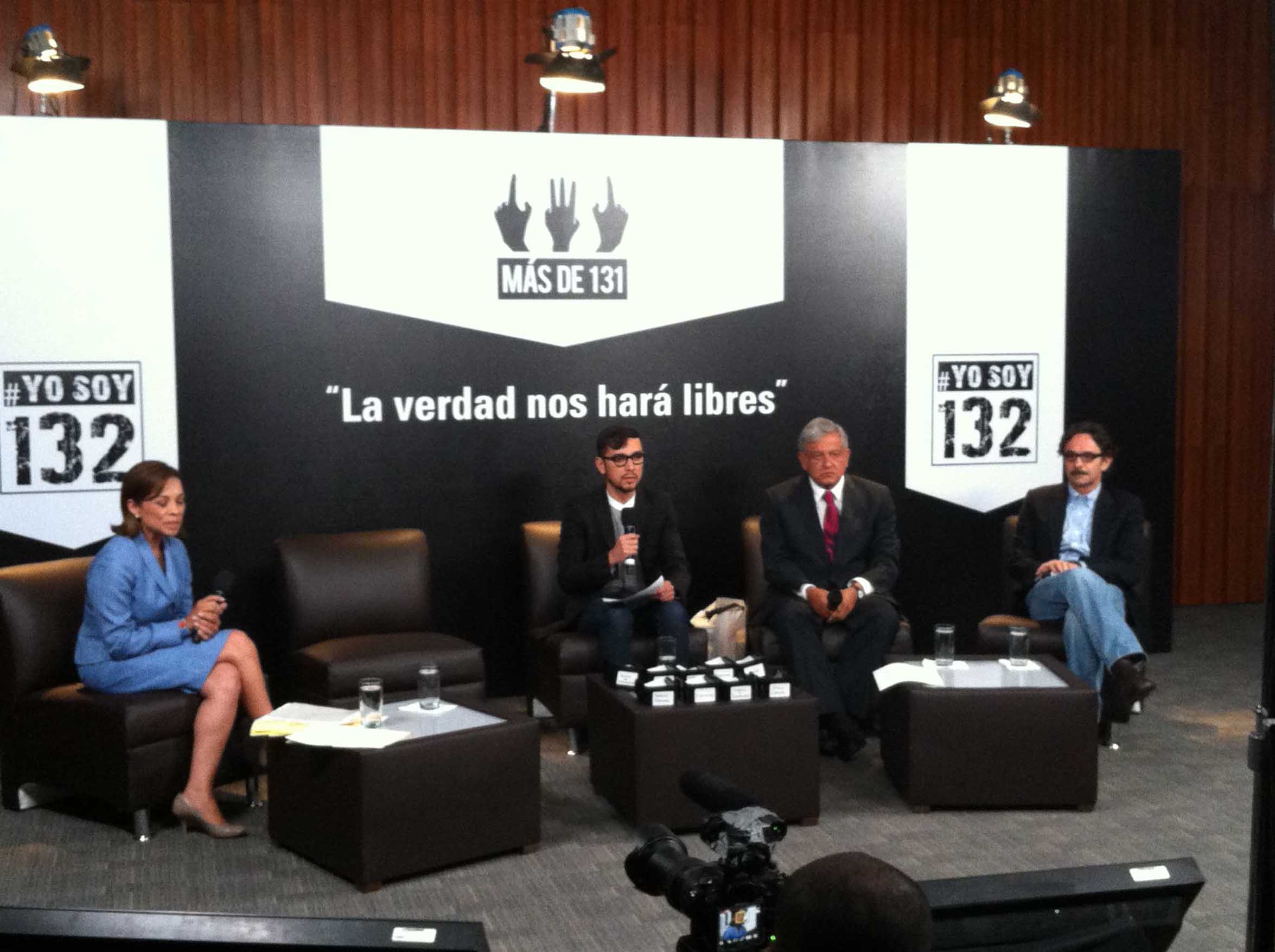 “Los que mandan realmente en el país se apoyan en los medios de comunicación para ejercer su dominio, con honrosas excepciones”, reiteró López Obrador, quien reiteró ante los integrantes del #YoSoy132 que los medios de comunicación “están queriendo imponer al próximo presidente de México”. Y la silla de Enrique Peña Nieto permaneció vacía.